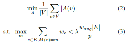 选定点切分的方式后,问题的目标就变成了如下优化问题,其中A(v)表示的是每个点v被切分到的cluster的集合,M(e) = m表示的是边e被分配到了cluster m中。公式(2)表示的是跨cluster的通信最小化。公式(3)表示的是每个cluster分得的边的权重的和(workload)是balanced,其中lambda是imbalance factor。