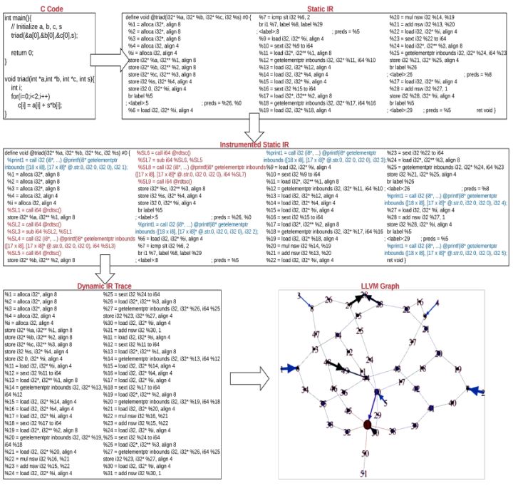 如何从IR文件中构造图呢?本工作从前端编译器编译的IR图出发,首先在IR文件中增加一些输出打印信息,用于测量内存操作的时间,进而将IR文件放到后端执行以得到每个内存操作的真实时间。图当中的边是由分析IR文件中分析指令的源寄存器和目的寄存器地址得来的: 如本指令从寄存器A中读数据,而上一条指令向寄存器A找那个写数据,那么就将这两条指令对应的点创建一条边。下图展现的是图构造的过程。