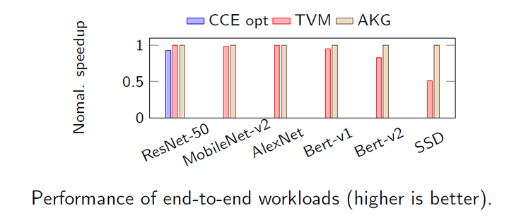 在整网的对比实验中,AKG在ResNet-50, MobileNet,AlexNet和TVM基本持平。但是在Bert和SSD上,超出TVM平均20.2%。此外,虽然在ResNet-50上CCE opt的整网性能最佳,但是手动优化需要大量的人力,而采用自动化工具,可以大大节省人力成本。