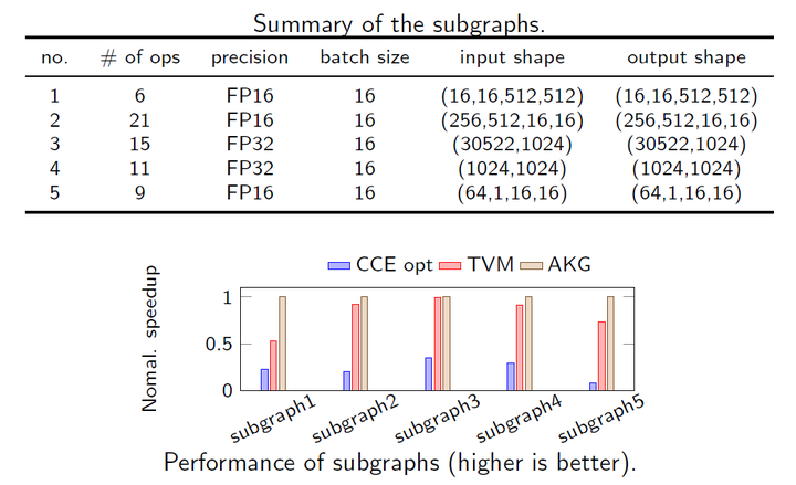 在子图融合的对比实验中,AKG平均超越adapted TVM1.3倍,平均超越CCE opt有5.6倍。
