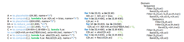 为了更友好的和前端的图编译器配合,AKG支持Graph Kernel Fusion算子json和TVM的DSL作为输入,来表征张量计算。同时为了弥补当前解决方案,在面向NPU后端时,调度原语中对自动transformation和自动内存管理的表征不足,AKG引入一个PASS将HalideIR转换为Polyhedral IR,便于后续进行基于多面体的IR变换。将多面体模型和TVM相结合,不仅可以重用后者现有的一些功能(减少重复造轮子的工作),还可以平衡两者的不足。