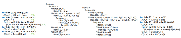 AKG利用基于整数线性规划的ISL调度器来对输入程序进行新的调度变换。ISL调度器以Pluto算法为主,并辅以Feautrier算法,在程序的并行性和局部性之间寻求最优。下图是一个循环融合的示例,该示例是一个2D卷积算子,后跟了两个abs和Relu的张量计算。在经过融合后,可以看到语句1,语句2,语句3合并到同一个Band节点之下。