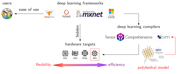 深度学习技术和深度学习编译技术目前一直是业界研究的热点,AI编译技术也可以从两个层次来看,偏前端的是基于图的编译器技术,偏后端的是基于张量的编译器技术。现有的张量编译器已经证明其在通用硬件上(CPU,GPU)部署深度神经网络的有效性,但部署在基于AI应用的NPU上,仍然具有非常大的挑战。