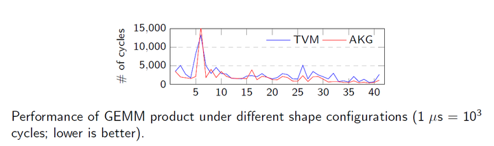 本实验,选取了41个shape大小从(64,64)到(4608,4608)不同大小的矩阵乘法来评估性能的稳定性。在41个不同的case中,AKG有29个case的性能优于TVM的结果。