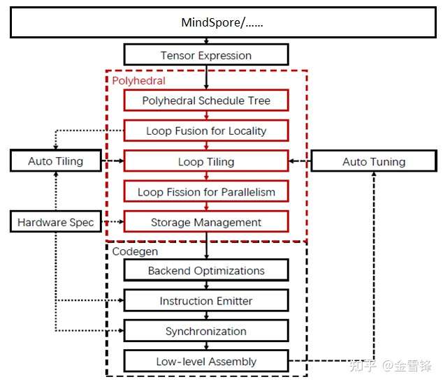 AKG利用多面体模型的调度算法,更好的同时挖掘程序并行性和局部性。利用多面体模型,AKG对loop fusion和loop tiling进行了很好的建模,并很好地实现了数据排布和内存层级之间的解耦。同时AKG将外部调度树作为输入来实现img2col卷积的转换。AKG还实现了基于NPU指令集的完备向量化方案,多级流水线的自动同步插入,以及auto-tuning来优化生成代码的性能。