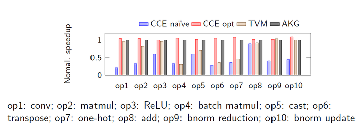 在单算子的对比实验中,我们可以看到手工优化后的CCE代码比优化前能提升2.8倍。AKG自动生成的代码性能,能够和优化后的CCE代码持平;并且平均超越TVM有1.6倍。