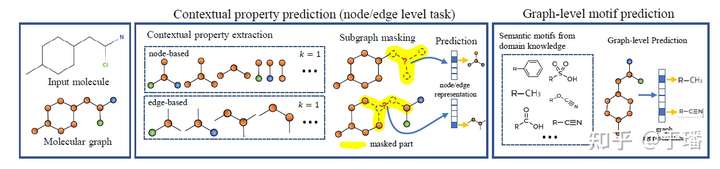 该模型在预训练过程中不使用监督标签,而是提取出了新的自监督学习任务:上下文属性预测(节点/边级)和图级基序预测。