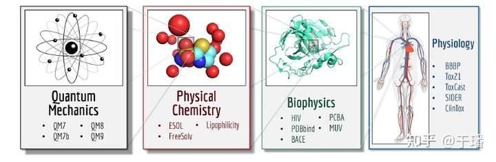 上述两类预训练模型的下游任务均在MoleculeNet榜单上进行了验证,经典的下游任务如下图所示。