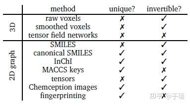 首先来看一下如何来表示一个分子,我们最常见的一般是化学表达式,但这并不适用于深度学习模型的输入。分子表示是指用于每个分子的数字编码,表示的方法必须捕获每个分子的基本结构信息,从分子结构中创建适当的表示称为特征化。一般表示需要有两个重要属性:唯一性和可逆性。唯一性意思就是每个分子结构为单一表示,可逆性指每个表示与单个分子相关联。大部分用于分子生成的表示都是可逆的,但并不一定是唯一的,原因例如旋转、平移等。下图列举了常用的分子表示方法(包含2D和3D表示)。