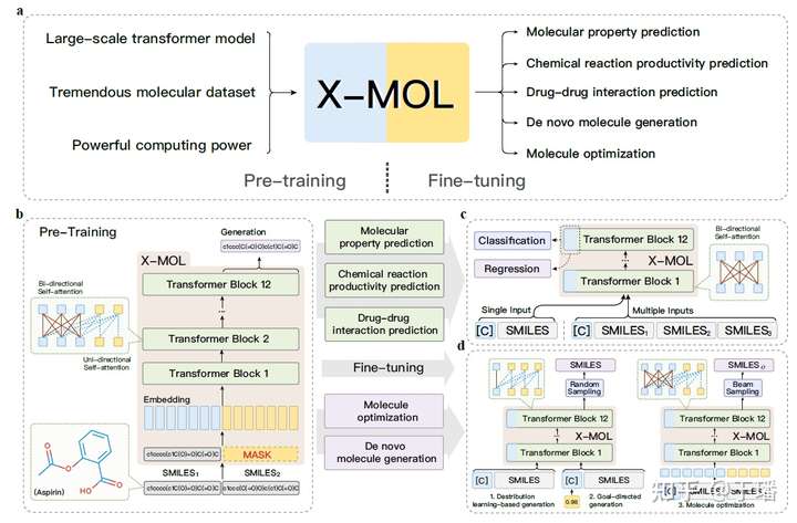 a)指X-MOL的工作流,包括pre-training和fine-tuning两大模块; b)指基于encoder-decoder的语言模型 c)指X-MOL用于不同下游任务的微调 d)指X-MOL用于不同生成任务