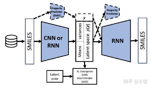 encoder部分可用CNN或RNN来提取分子特征,之后压缩到隐层空间中,通过VAE采样隐层向量,接RNN decoder来解码生成分子SMILES表达式,采样的存在也使得生成的分子多样性得到一定的保证。