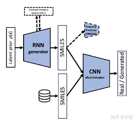 当然以RNN为基础的GAN网络通过生成对抗的方式也广泛应用于分子生成任务,引入了一个Discriminator,通过Discriminator来判别输入的SMILES是属于reconstruct之后的SMILES,还是属于真实的数据,这样相当于额外增加了loss。模型结构如下图: