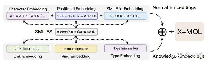 该工作中提到的“SMILES is all you need”这种思想也比较有意思,将SMILES表达式新采用knowledge embedding的形式,包含三种策略的embedding,分别为link embedding,ring embedding和type embedding,之后和传统的embedding(Char embedding,Pos embedding以及id embedding)进行结合。