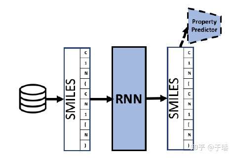 以RNN为基础的分子生成模型结构如下图,分子表示以SMILES为例(其表示应用最为广泛)