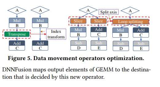 本文提出依据算子属性对算子合理的进行类别划分,按类型融合,具有更好覆盖性和融合识别能力,加速了计算。 模型命名为DNNFusion,主要包括三部分:1)代数化简部分,即将图层上的数学表达替换为更高效的模式 2)算子融合部分,依据自定义的类别划分和融合算法将1或多个算子融合成一个新算子 3)后续优化。