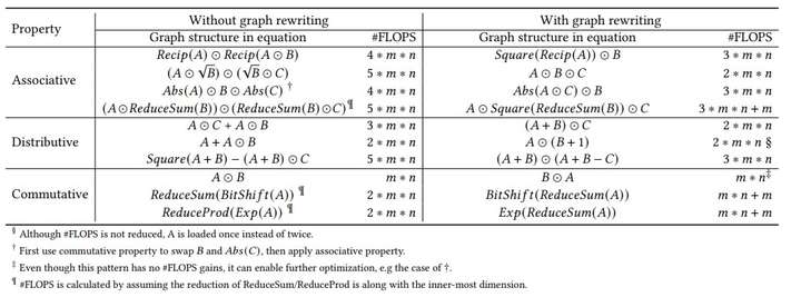 DNNFusion中也应用了代数化简,作者将代数化简分为结合律、分配律和交换律三类,共包含45条结合律化简,38条分配律化简和66条交换律化简。下图具体列举了一些实例。