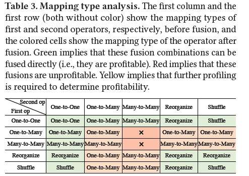 上图中的绿色区域代表一定可以融合的场景,红色区域代表(One-to-Many与Many-to-Many, Many-to-Many与Many-to-Many)代表一定不能融的场景,橙色区域部分代表不确定融合后是否有收益,作者用了ML的方式来根据具体场景来判断是否融合。