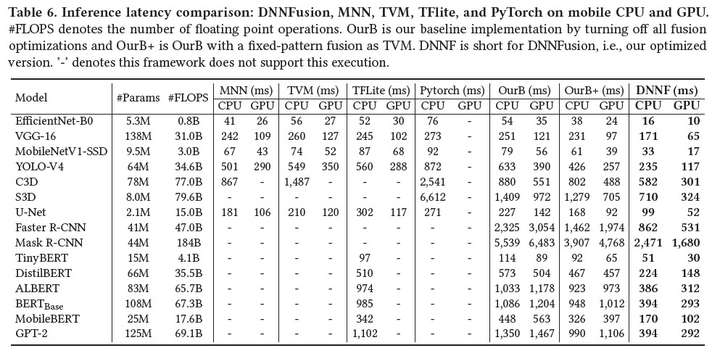 作者选取了多种神经网络模型的推理部分进行mobile端实验,实验中DNNFusion会以PatDNN[2](该团队之前提出的针对算子的底层代码加速工具) 为基础,结果如下(OurB代表不开DNNFusion,即为baseline):