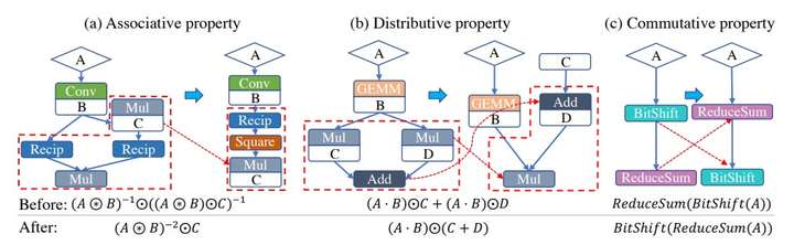 代数化简是一个在算子层加速中较通用的手段,即将某种特定的tensor计算转化为数学上等价的tensor计算,转化后的计算方式须较转化之前的计算方式计算量更小。下图为几个转化案例:
