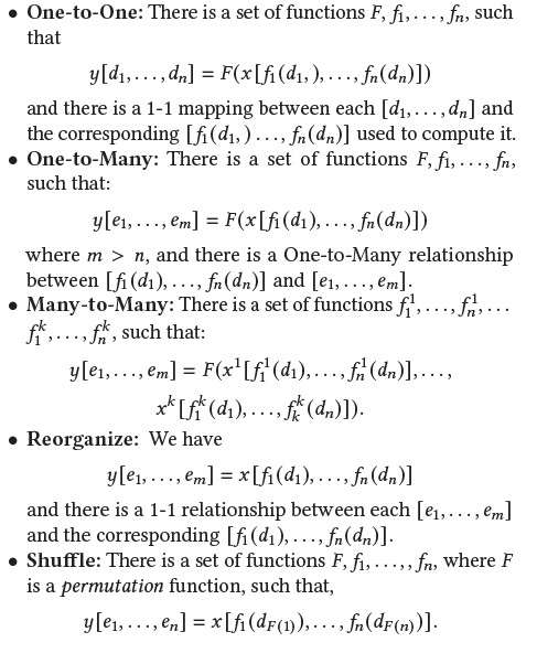 input上的i位与output上i位存在一对一映射关系;One-to-Many表示input上的i位与output上多位是映射关系;One-to-Many表示input上多位与output上多位是映射关系;Reorganize和Shuffle同样也是一对一映射关系,但是二者相对One-to-One的不同是,从input到output的映射存在index的转换,比如input的i位数字可能映射到output的j位数字,其中Shuffle相对于Reorganize更为严格,其index映射关系须为permutation类。