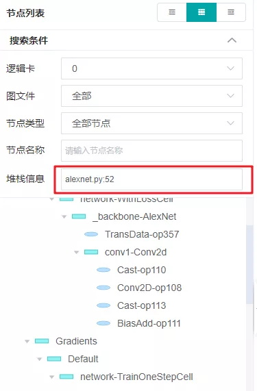 输入想要查找的代码行(例如alexnet.py:52),即可寻找同此行代码关联的计算图节点。