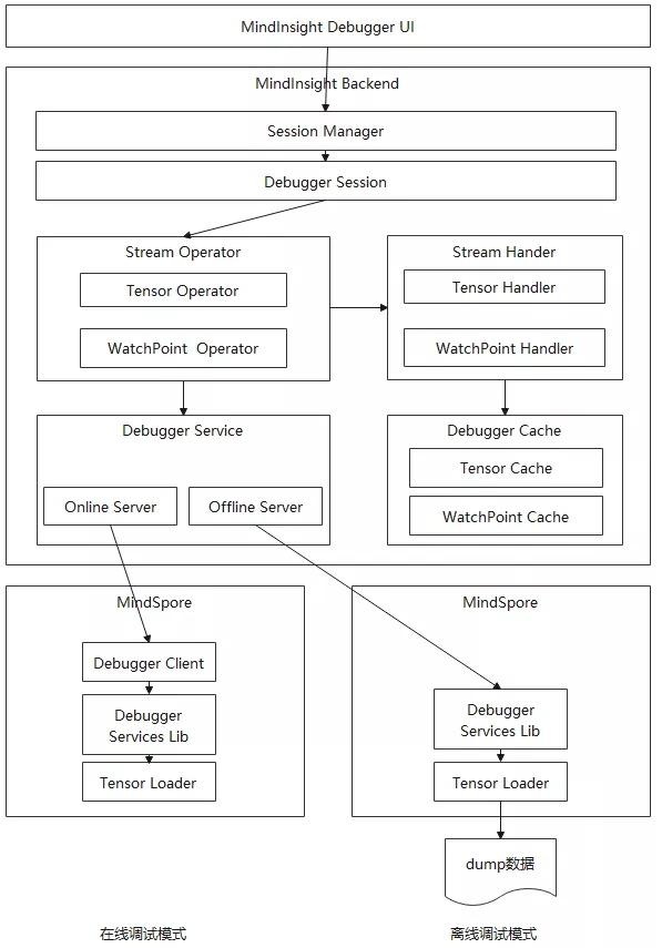 5.Debugger Service 负责驱动MindSpore中的相关调试器功能。在线调试模式下由Online Server同MindSpore中的Debugger Client交互。离线调试模式下由Offline Server在同一进程中直接调用Debugger Services lib,完成监测点检查和张量读取等功能。