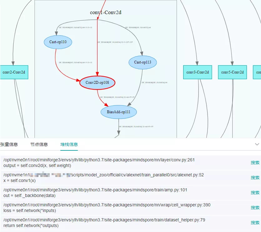 在计算图中选中算子节点(例如Conv2d-op108),即可在堆栈信息中查看该算子对应的代码行。