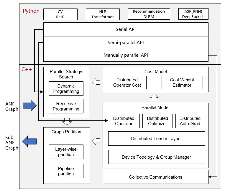 MindSpore自动并行的目的是构建数据并行、模型并行和混合并行相结合的训练方法。该方法能够自动选择开销最小的模型切分策略,实现自动分布并行训练。
