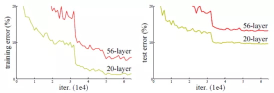 通过上图1可以发现在不改变网络结构的情况下,仅加深网络深度的56层网络相较于20层在误差上表现都更大。