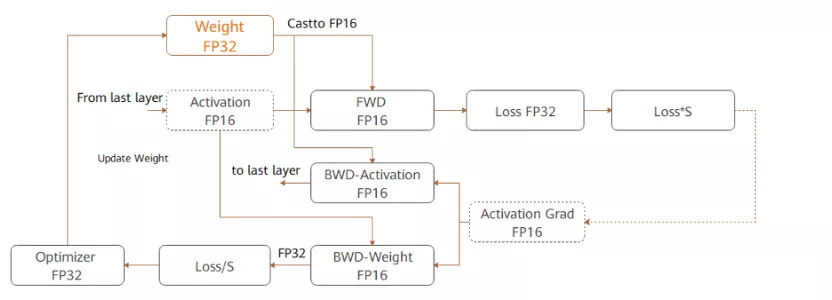 第一种方案,可以根据传入的traincfg实现自动混合精度,并提供了不同优化级别(O0不改变算子类型,O2将算子转成fp16模型,batchnorm和loss保持fp32,O3在O2基础上将batchnorm和loss转成fp16),也支持配置fp16算子自定义配置手动混合精度方案,提供了性能和精度之间的选择,更具灵活性。其计算流程如下:
