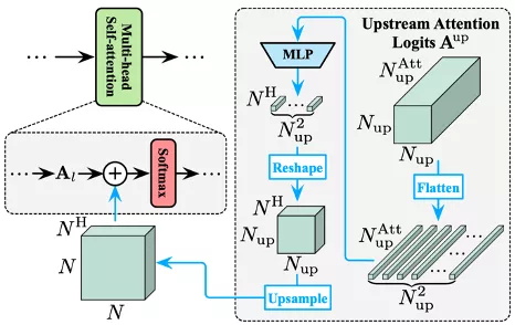 除特征复用机制外,位于下游的模型同样可以借助上游Transformer已经得到的注意力图来进行更准确的全局注意力关系建模,基于此,提出关系复用机制,示意图如下图6所示。将上游模型的全部注意力图以logits的形式进行整合,经MLP变换和上采样后,加入到下层每个注意力图的logits中。这样,下游模型每一层的attention模块都可灵活复用上游模型不同深度的全部attention信息,且这一复用信息的“强度”可以通过改变MLP的参数自动地调整。