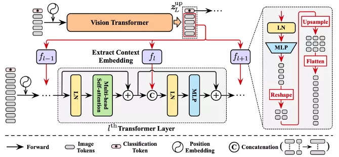 当一个处于下游位置的Transformer被激活时,应当训练其在先前Transformer的特征的基础上进行进一步提升,而非完全从0开始重新提取特征。基于此,论文提出特征复用机制使训练更为高效,如下图5所示。将上游Transformer最后一层输出的特征取出,经多层感知器变换和上采样后,作为上下文嵌入整合入下游模型每一层的多层感知器模块中。