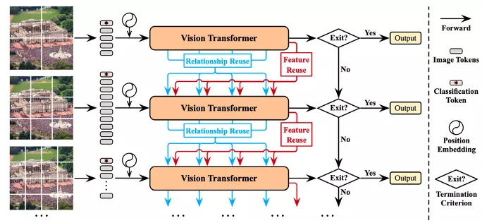 首先介绍DVT的推理过程,如图4所示,对于任意测试样本,首先将其粗略表征为最小数目的token,判断预测结果是否可信,若可信,则直接输出当前结果并终止推理;若不可信,则依次激活下一个Transformer将输入图片表征为更多的token,进行更细粒度、但计算开销更大的推理,得到结果之后再次判断是否可信,以此类推。值得注意的是,处于下游的Transformer可以复用上游模型已产生的深度特征(特征复用机制)和注意力图(关系复用机制),以尽可能避免进行冗余和重复的计算。
