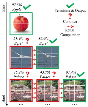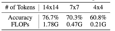 这一问题对于网络的推理效率是非常关键的。从表1中可以看到,若将token数目设置为4x4,准确率仅仅下降了15.9%(76.7% v.s. 60.8%),但计算开销下降了8.5倍(1.78G v.s. 0.21G)。这一结果表明,正确识别占数据大多数的较“简单”的样本只需4x4或更少的token,相当多的计算浪费在了使用存在大量冗余的14x14 token表征他们!