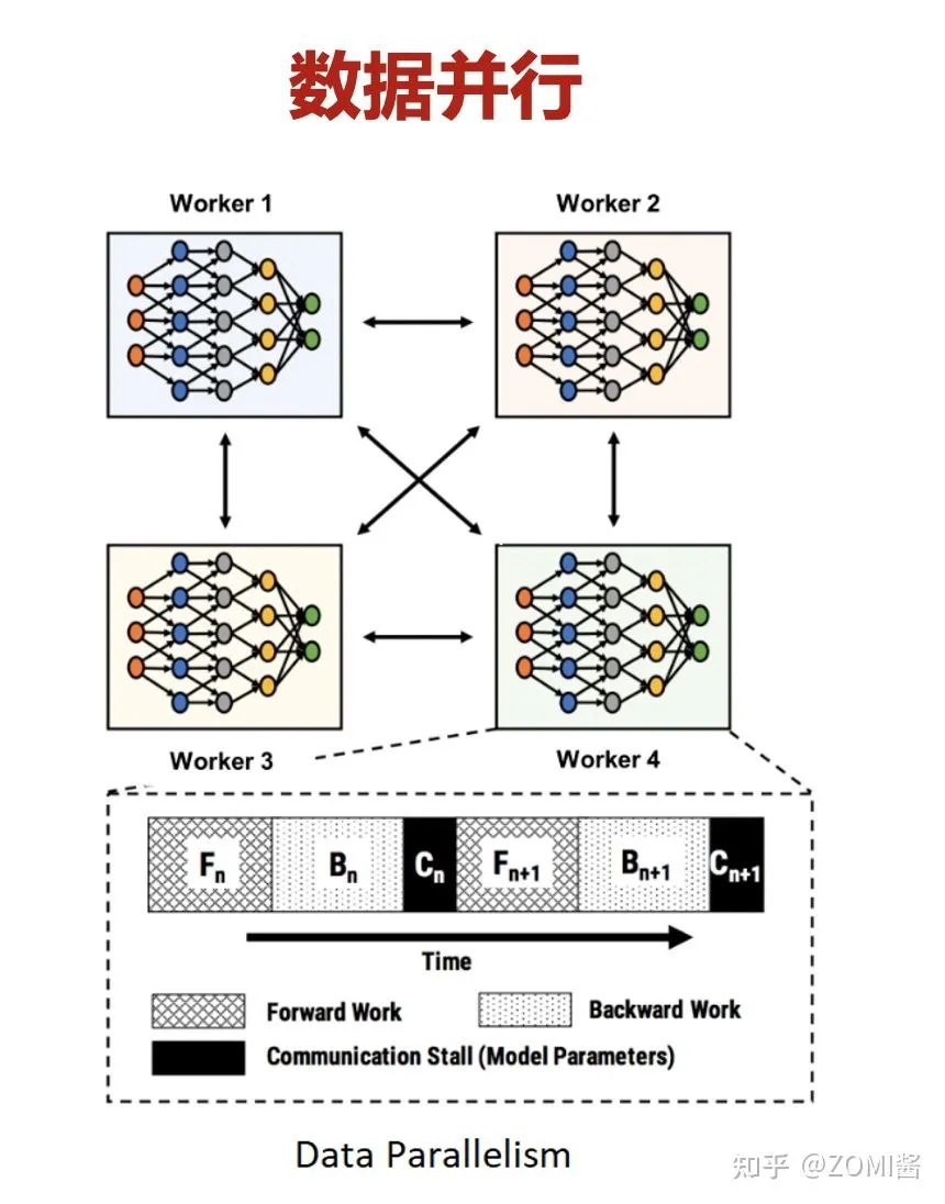 **数据并行:**在分布式训练场景,因为数据规模增大,可以通过数据并行,可以对输入数据进行切分,每块AI芯片只需要处理一部分数据。优点是计算通信可以重叠,通信需求低,并行效率高;缺点是无法运行大模型。