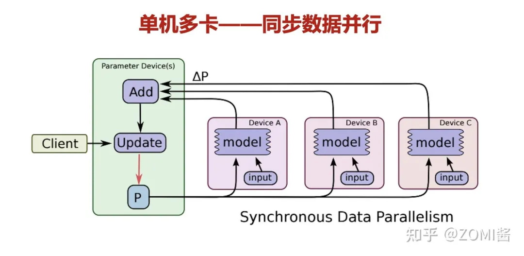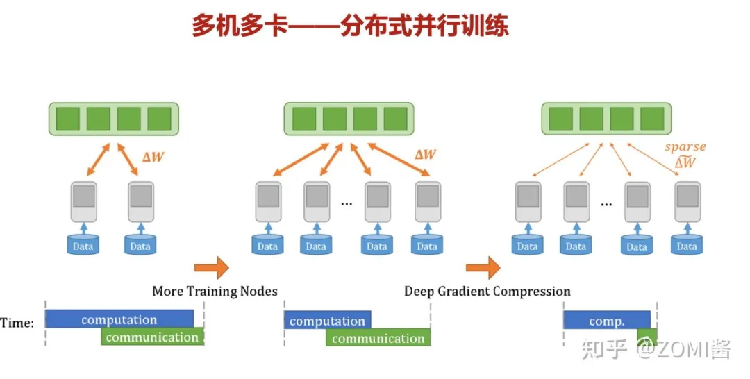 常见的训练方式是单机单卡,也就是一台服务器配置1块AI芯片,这是最简单的训练方式。随着数据量的增加,希望加快模型的训练速度,于是出现了单机多卡,多块AI芯片并行,以一台机器上配置8块AI芯片为例,把数据切分成8份,分别在8块AI芯片上都跑一次BP算法,计算出梯度,然后所有AI芯片上计算出的梯度进行平均,更新模型参数。这样的话,以前一次BP只能训练1个batch的数据,现在就是8个batch。