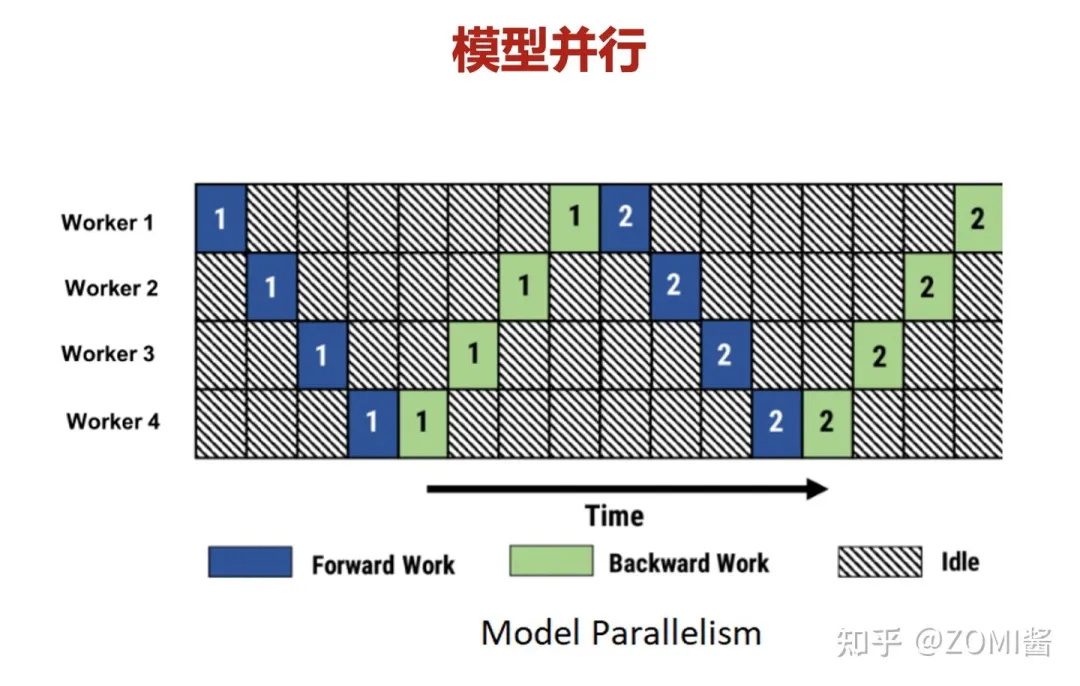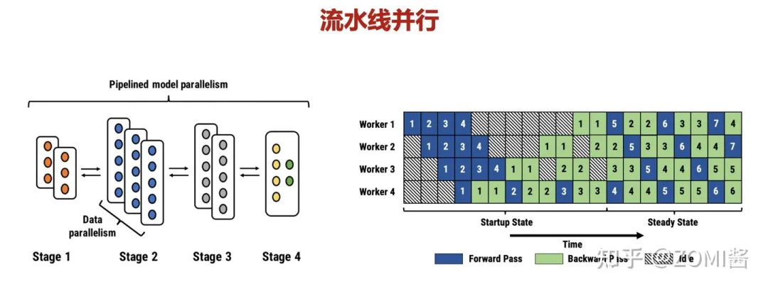 **流水线并行:**另外还可以利用流水并行,将不同的网络层放在不同的AI芯片上运行,进而进一步将计算负载和内存负载切分至多块AI芯片。优点是计算的通信可以重叠,通信需求低;但是存在流水线间空闲bubble,需要和重计算配合使用。
