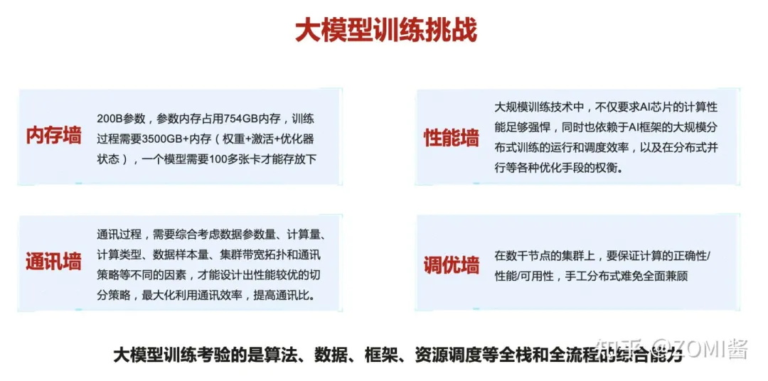 总结一句话,大模型训练考验的是算法、数据、框架、资源调度等全栈和全流程的综合能力。