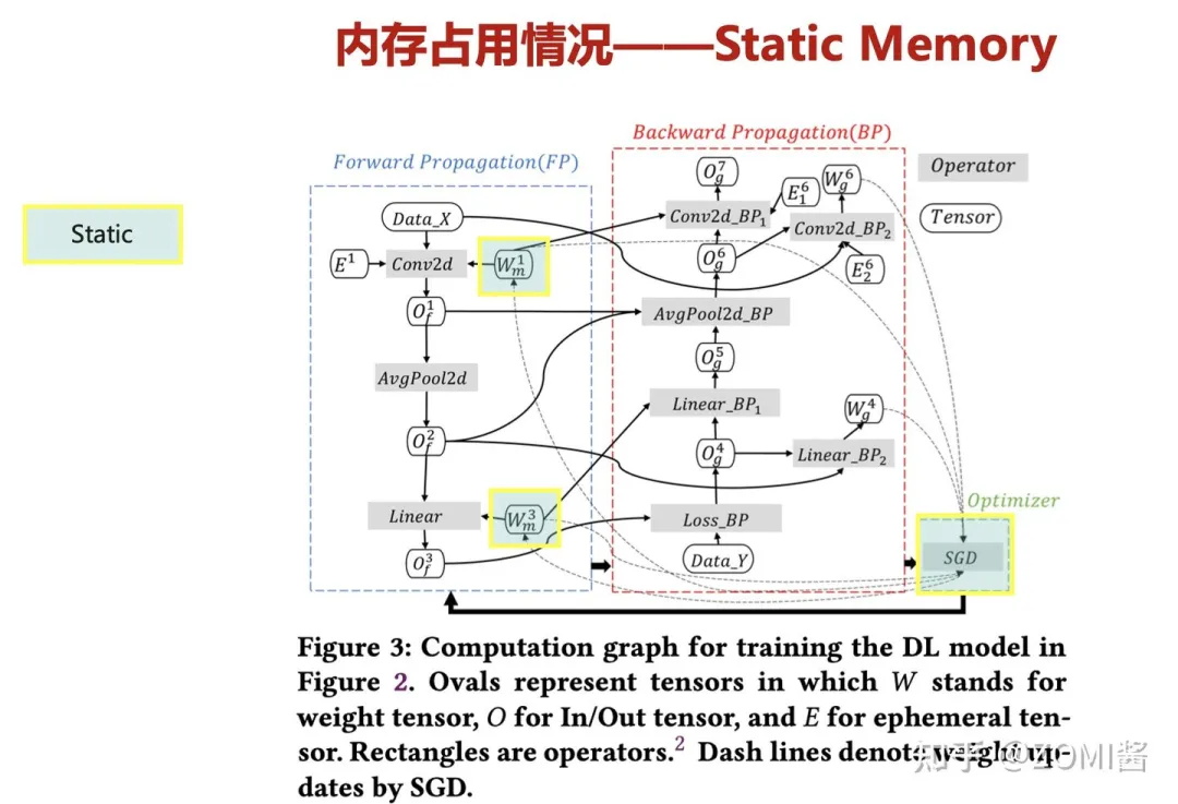 在计算过程中,神经网络模型每一层的卷积或者全连接计算,都会把权重W_m长期保存下来,用作网络的权重参数更新。另外针对诸如ADAM的优化器,会存储优化器的动量等信息,用于优化器计算。