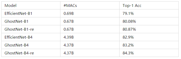 在Imagenet上,我们利用的提出的方法将GhostNet基础网络进行放大,构建出GhostNet-B1和B4。如下表,我们的GhostNet大模型取得了比EfficientNet系列更好的结果。