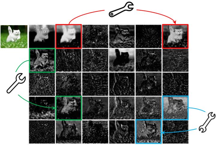 在一个训练好的深度神经网络中,通常会包含丰富甚至冗余的特征图,以保证对输入数据有全面的理解。如下图所示,在ResNet-50中,将经过第一个残差块处理后的特征图拿出来,三个相似的特征图对示例用相同颜色的框注释。 该对中的一个特征图可以通过廉价操作(用扳手表示)将另一特征图变换而获得,可以认为其中一个特征图是另一个的“幻影”。因为,本文提出并非所有特征图都要用卷积操作来得到,“幻影”特征图可以用更廉价的操作来生成。