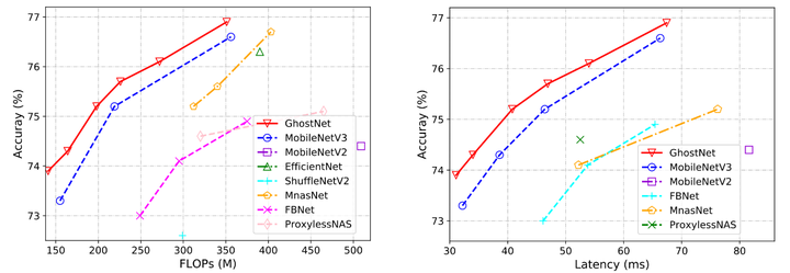 在本文中,作者提出了一种新颖的Ghost模块,可以使用更少的参数来生成更多特征图。具体来说,深度神经网络中的普通卷积层将分为两部分。第一部分涉及普通卷积,但是将严格控制它们的总数。给定第一部分的固有特征图,然后将一系列简单的线性运算应用于生成更多特征图。与普通卷积神经网络相比,在不更改输出特征图大小的情况下,该Ghost模块中所需的参数总数和计算复杂度均已降低。基于Ghost模块,作者建立了一种有效的神经体系结构,即GhostNet。作者首先在基准神经体系结构中替换原始的卷积层,以证明Ghost模块的有效性,然后在几个基准视觉数据集上验证GhostNet的优越性。实验结果表明,所提出的Ghost模块能够在保持相似识别性能的同时降低通用卷积层的计算成本,并且GhostNet可以超越MobileNetV3等先进的高效深度模型,在移动设备上进行快速推断。