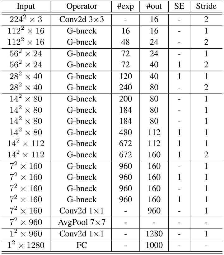 GhostNet:基于Ghost bottleneck,作者提出GhostNet,如表1所属。作者遵循MobileNetV3的基本体系结构的优势,然后使用Ghost bottleneck替换MobileNetV3中的bottleneck。GhostNet主要由一堆Ghost bottleneck组成,其中Ghost bottleneck以Ghost模块为构建基础。第一层是具有16个卷积核的标准卷积层,然后是一系列Ghost bottleneck,通道逐渐增加。这些Ghost bottleneck根据其输入特征图的大小分为不同的阶段。除了每个阶段的最后一个Ghost bottleneck是stride = 2,其他所有Ghost bottleneck都以stride = 1进行应用。最后,利用全局平均池和卷积层将特征图转换为1280维特征向量以进行最终分类。SE模块也用在了某些Ghost bottleneck中的残留层,如表1中所示。与MobileNetV3相比,这里用ReLU换掉了Hard-swish激活函数。尽管进一步的超参数调整或基于自动架构搜索的Ghost模块将进一步提高性能,但表1所提供的架构提供了一个基本设计参考。