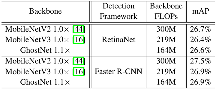 为了进一步评估GhostNet的泛化能力,作者在MS COCO数据集上进行了目标检测实验。具有功能金字塔网络(FPN)的两阶段Faster R-CNN和单阶段的RetinaNet作为baseline,而GhostNet用于骨干网络做特征提取器。下表显示了检测结果,其中FLOPs是使用224x224输入图像计算的。通过使用显着降低的计算成本,GhostNet可以在单阶段的RetinaNet和两阶段的Faster R-CNN框架上达到和MobileNetV2和MobileNetV3类似的mAP。