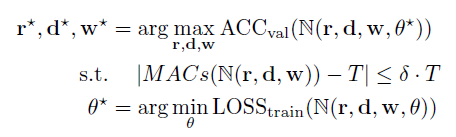 上式中,N表示网络,θ表示网络中的待训练参数,r,d,w分别表示网络的输入分辨率,深度和宽度,δ是预设的误差阈值,T表示目标计算量。