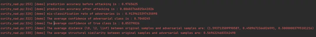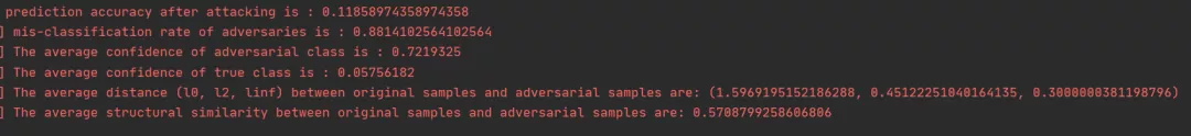 对模型进行FGSM无目标攻击后,模型精度由11%,误分类率高达89%,成功攻击的对抗样本的预测类别的平均置信度(ACAC)为 0.721933,成功攻击的对抗样本的真实类别的平均置信度(ACTC)为 0.05756182,同时给出了生成的对抗样本与原始样本的零范数距离、二范数距离和无穷范数距离,平均每个对抗样本与原始样本间的结构相似性为0.5708779。