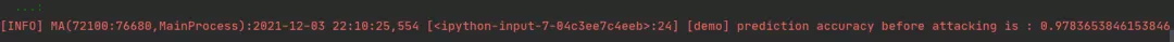 LOGGER.info(TAG, 'prediction accuracy before attacking is : %s', accuracy)