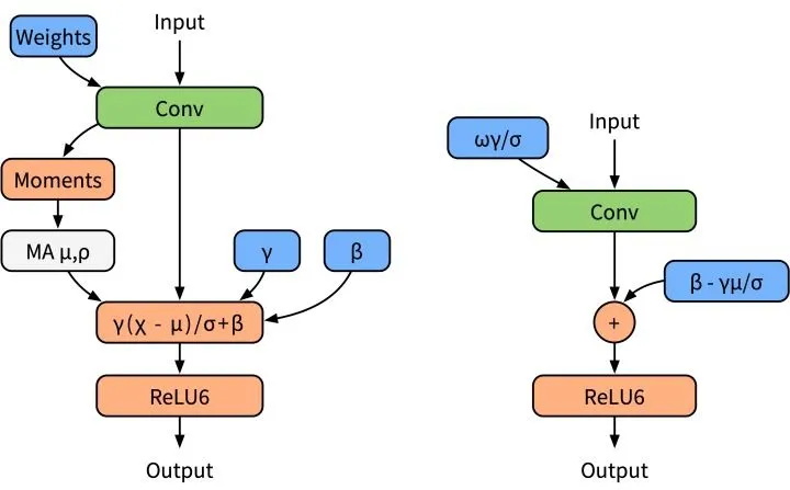 网络模型中经常使用BN层对数据进行规约,有效降低上下层之间的数据依赖性。然而大部分在推理框架当中都会对BN层和卷积操作进行融合,为了更好地模拟在推理的时候的算子融合操作,这里对BN层进行folding处理。下面左边图是(a)普通训练时模型,右边图是(b) 融合后推理时模型。
