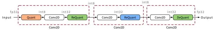 INT8相乘、加之后的结果用INT32格式存储,如果下一Operation需要float32格式数据作为输入,则通过Dequantize反量化操作将INT32数据反量化为float32。