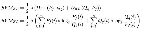 - Symmetric Kullback-Leibler Divergence(对称KL散度):对于 Pf、Qq 两个分布,Pf相对Qq 与Qq相对PfKL Divergence是不同的,Symmetric KL Divergence的计算方式为 Pf 相对Qq与Qq相对的KL Divergence的均值,计算方式如下: